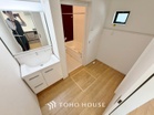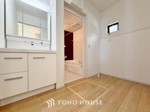 明るく清潔感のある洗面室には、機能的な三面鏡と使いやすい収納付き洗面台、洗濯機置場も備えています。