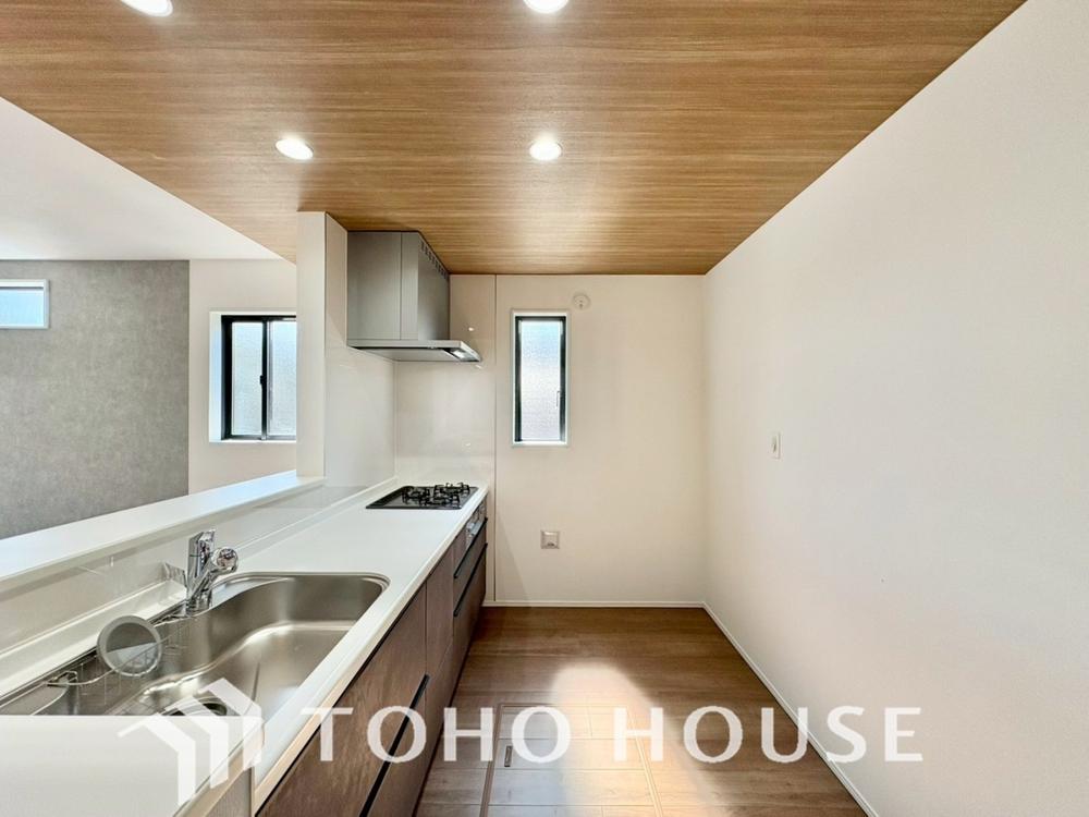 夫婦そろってキッチンに立っても調理がしやすく余裕の広さ。家事をしながら会話も弾みます。