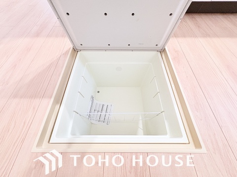 スペースを上手く活用した床下収納はあると何かと便利。食料のストック品はもちろん、掃除用具など。