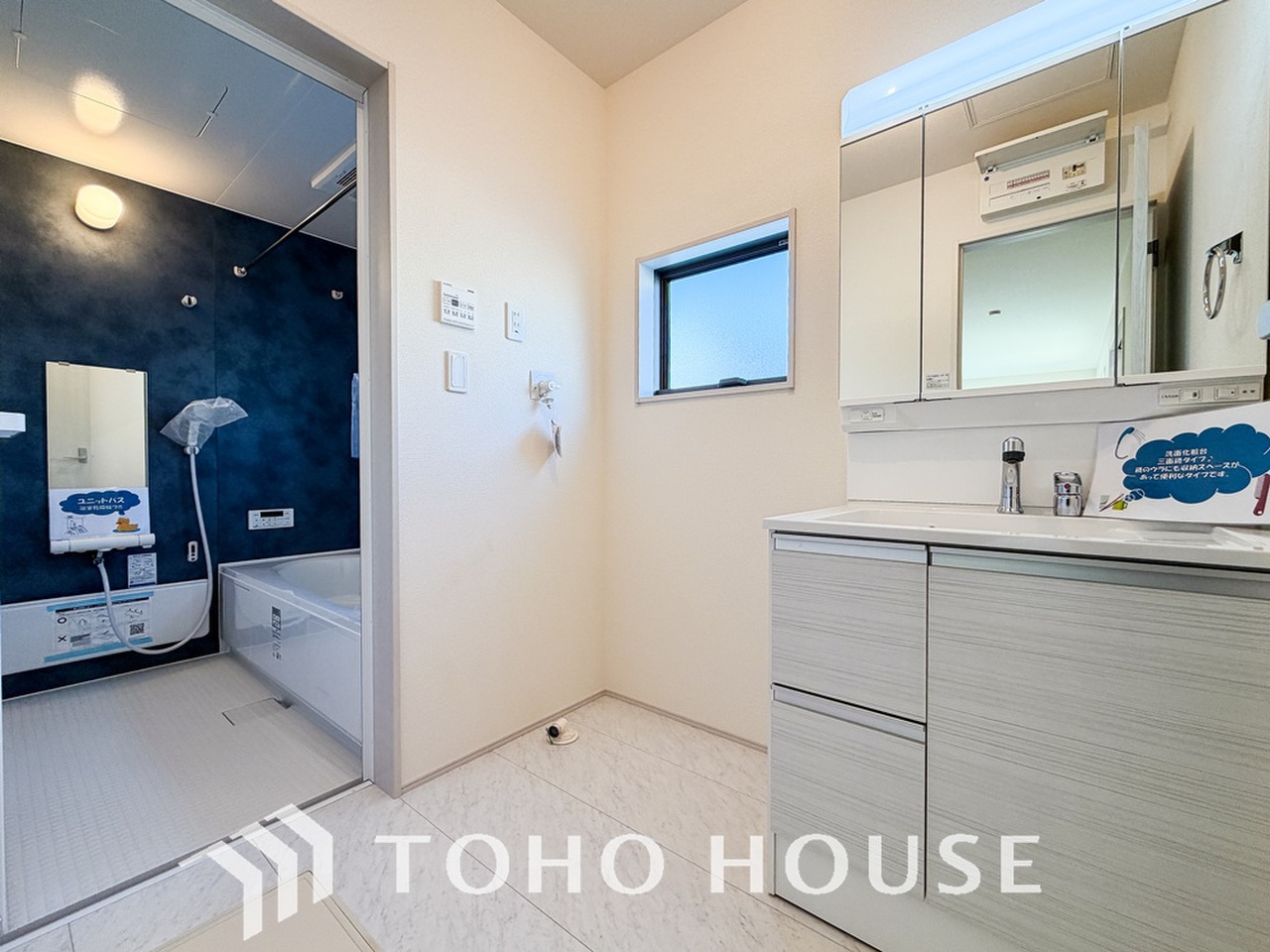 身だしなみのチェックがしやすい大きな鏡、下には収納がたっぷり。スッキリとした空間を演出いたします。