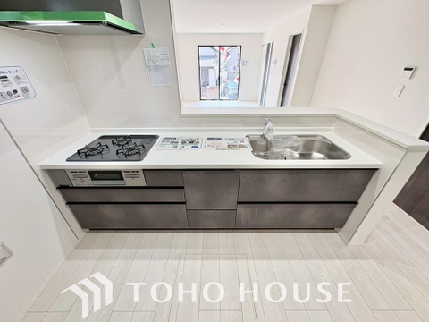 作業スペースを多くとった対面キッチン。夫婦そろってキッチンに立っても調理がしやすくゆとりある広さ。