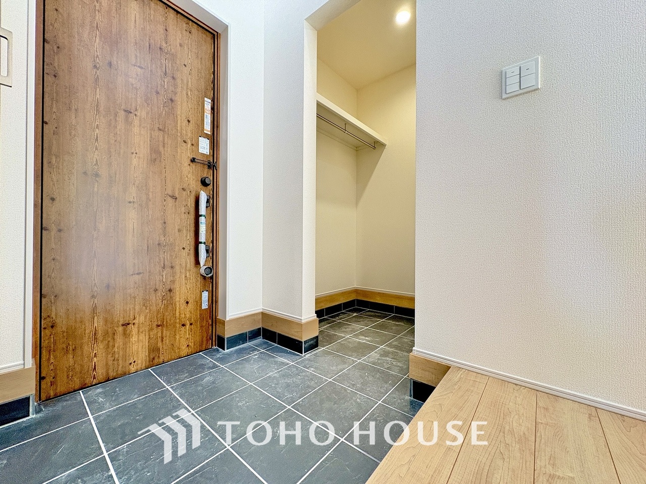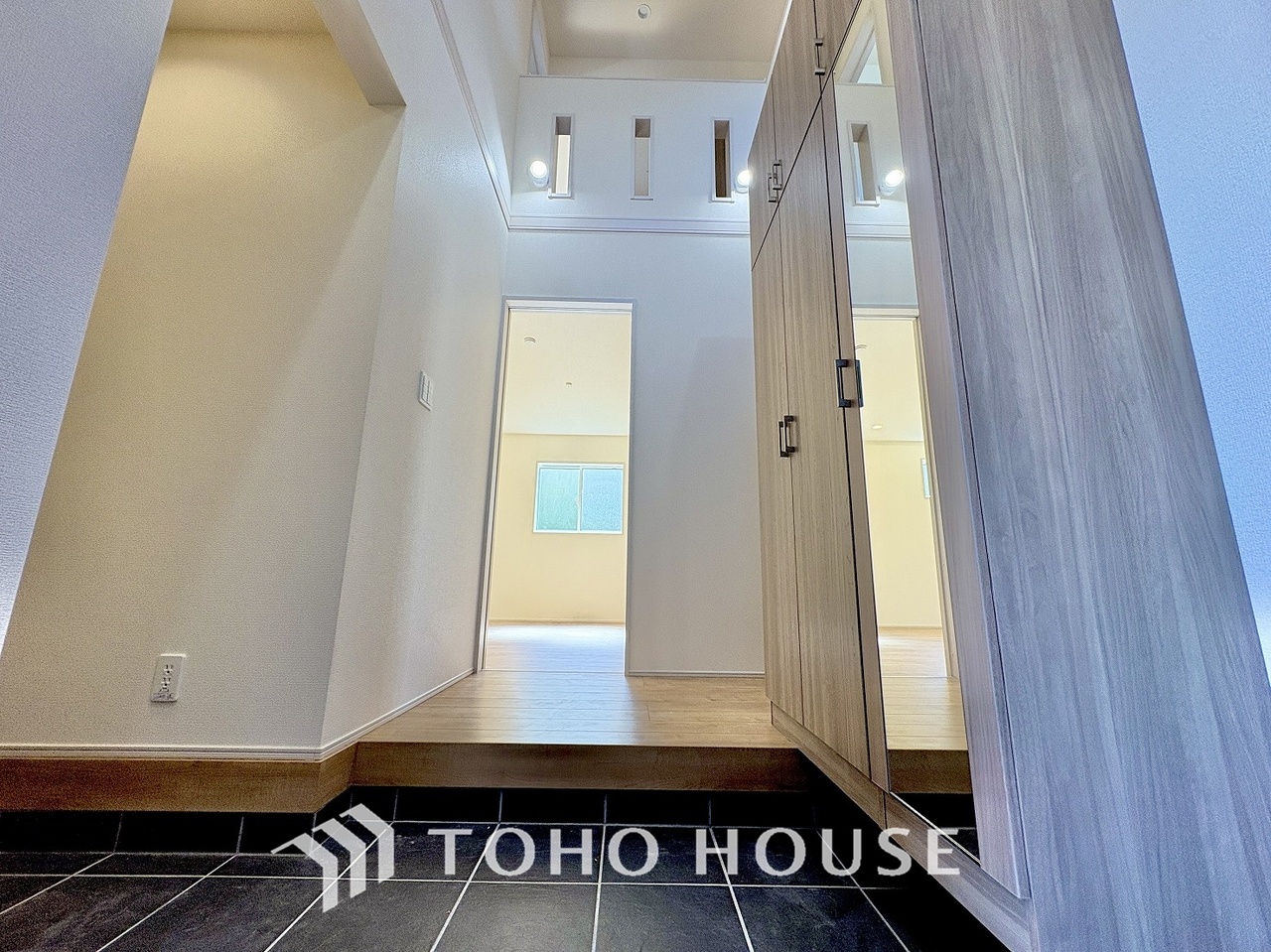 吹き抜けを採用した玄関は開放感のある空間となっています。明るい玄関は、毎日がワクワクしそうです。