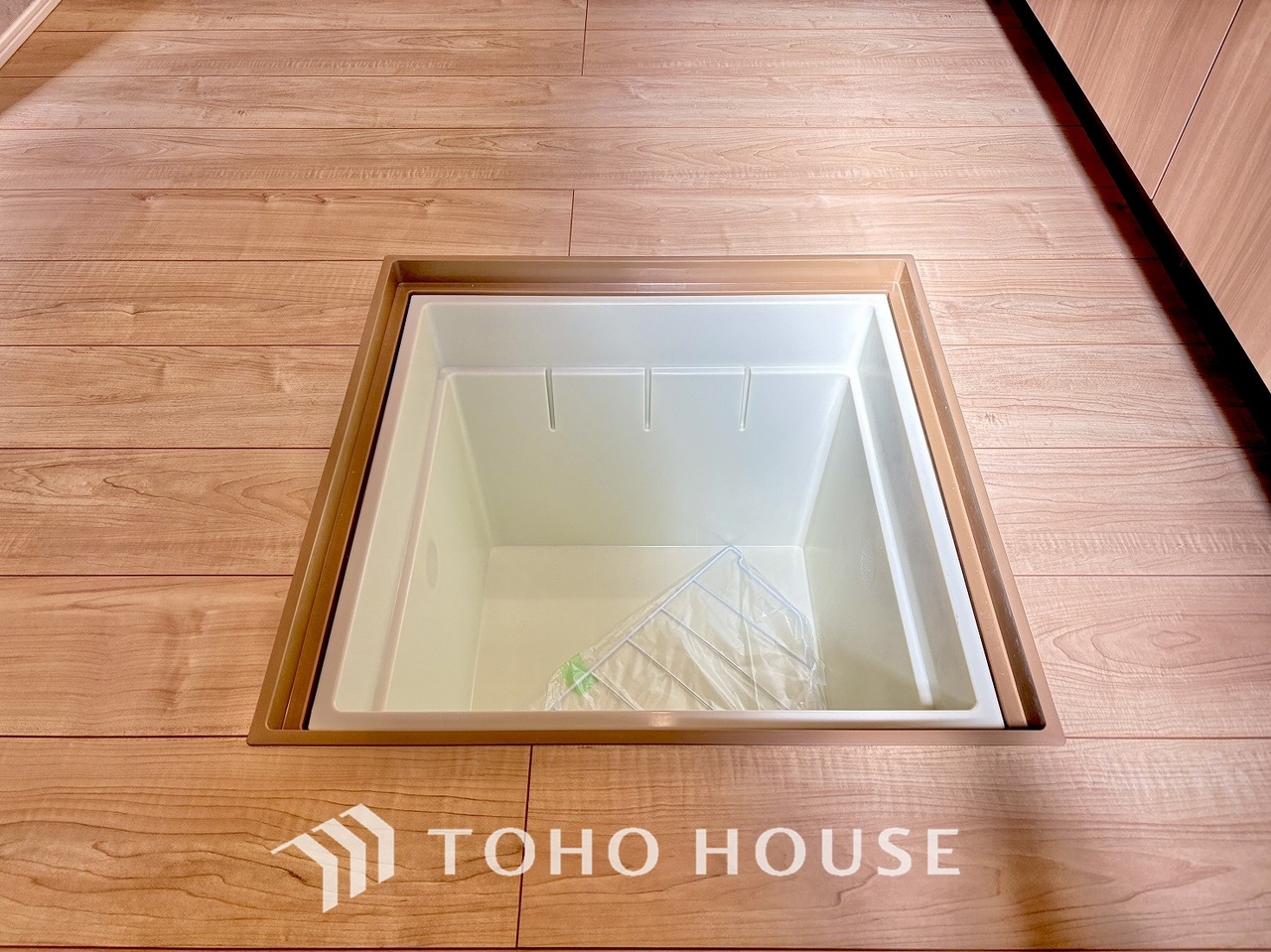スペースを上手く活用した床下収納はあると何かと便利。食料のストック品はもちろん、掃除用具など。