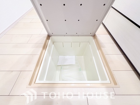 キッチン下部に設けた床下収納。缶詰のストックや非常食、梅酒や味噌などの保存食入れとして利用可です。