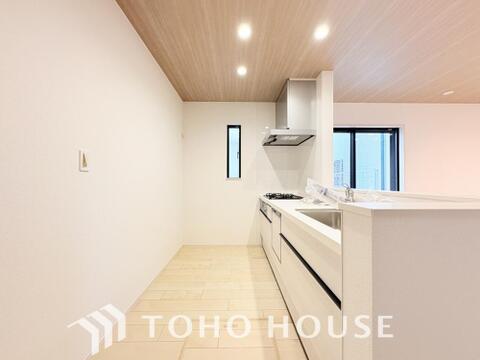 夫婦そろってキッチンに立っても調理がしやすく余裕の広さ。家事をしながら会話も弾みます。