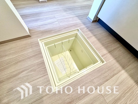 キッチン下部に設けた床下収納は、缶詰のストックや非常食、梅酒や味噌などの保存食入れとしての他、卓上プレートや季節家電などの物を仕舞うことが出来る便利な収納。