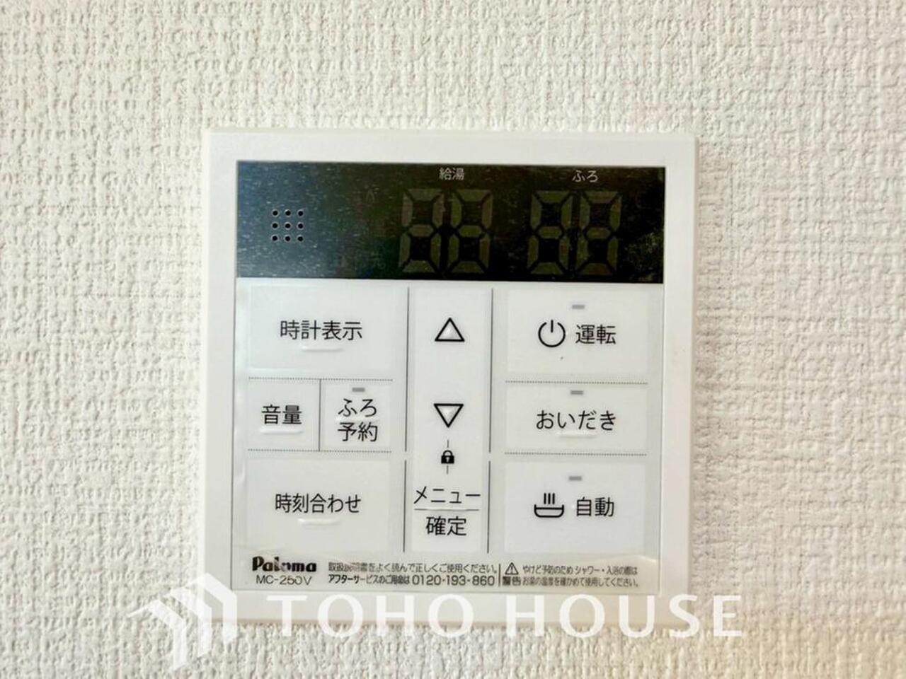お風呂場と台所に操作リモコンがあり、キッチン近くにある給湯リモコンは、お料理の最中でもリビングで寛いでいるなかでもボタン一つで簡単に沸かせて便利ですね。