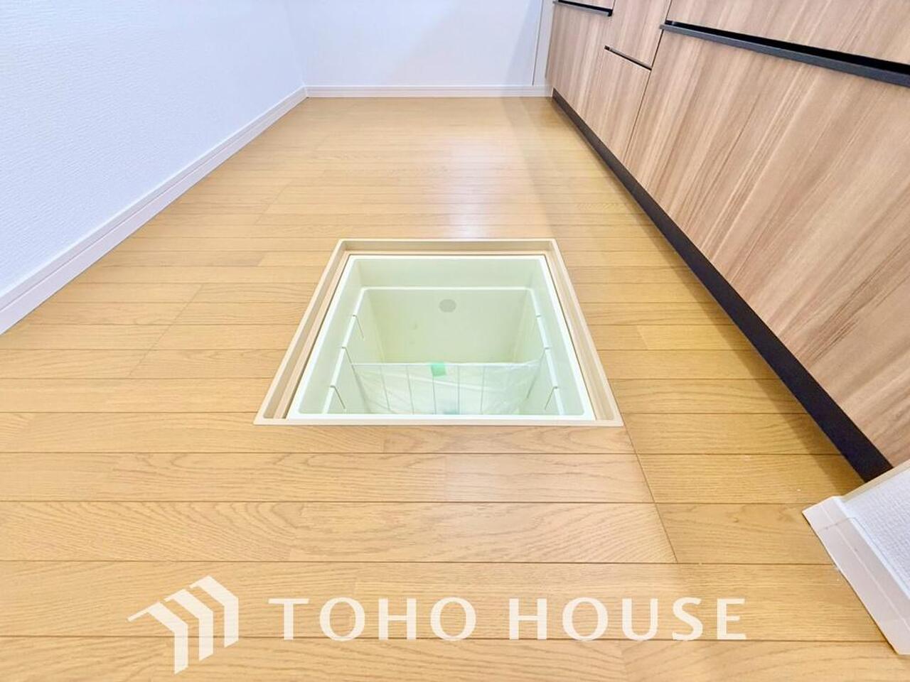 「床下収納」キッチン下部に設けた床下収納は、食品のストックや非常食、保存食の保管庫・収納庫として活用できます。また、住まいの診断・点検時には床下点検口としての役割もあります。