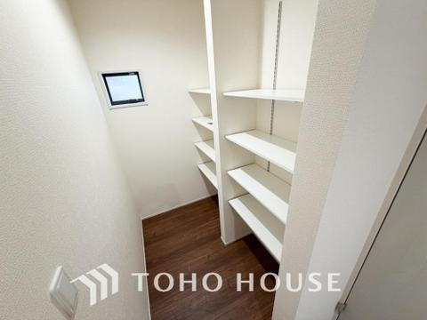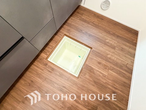 スペースを上手く活用した床下収納はあると何かと便利。食料のストック品はもちろん、掃除用具など。