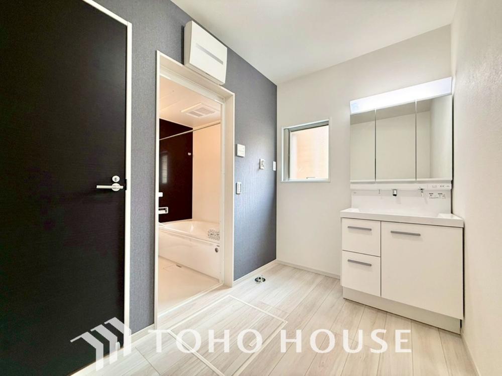 身だしなみのチェックがしやすい大きな鏡、下には収納がたっぷり。スッキリとした空間を演出いたします。