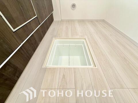 キッチン下部に設けた床下収納。缶詰のストックや非常食、梅酒や味噌などの保存食入れとして利用可です。