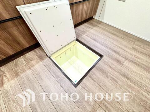 キッチン下部に設けた床下収納は、缶詰のストックや非常食、梅酒や味噌などの保存食入れとしての他、卓上プレートや季節家電などの物を仕舞うことが出来る便利な収納。
