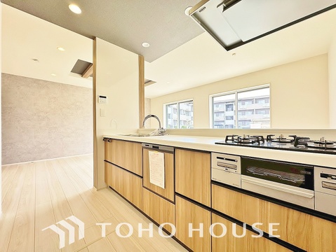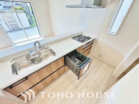 ビルトイン食器洗浄乾燥機付きのシステムキッチン。毎日の家事負担を軽減する嬉しい設備です。