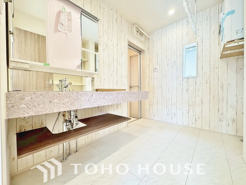 身だしなみのチェックがしやすい大きな鏡、下には収納がたっぷり。スッキリとした空間を演出いたします。