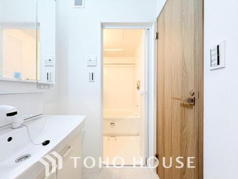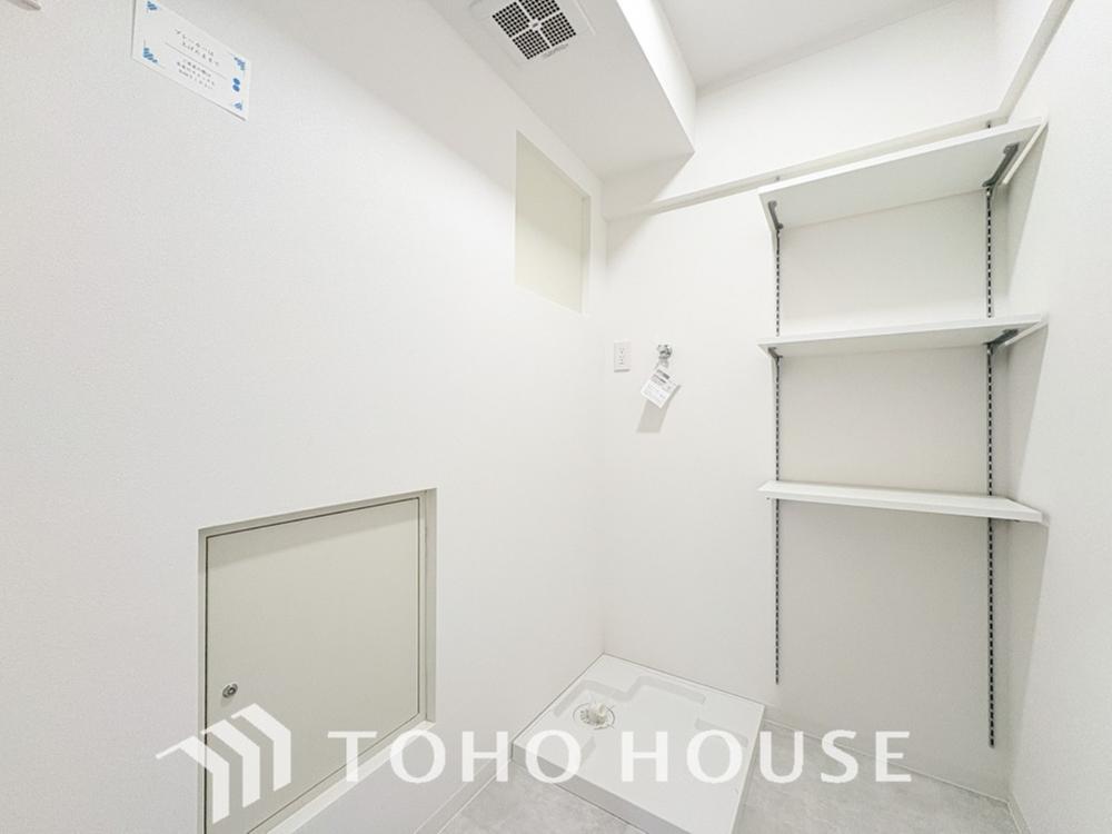 洗面台の収納以外に、タオルや着替え等を収納する事が出来るように、サニタリー収納棚を設けております。