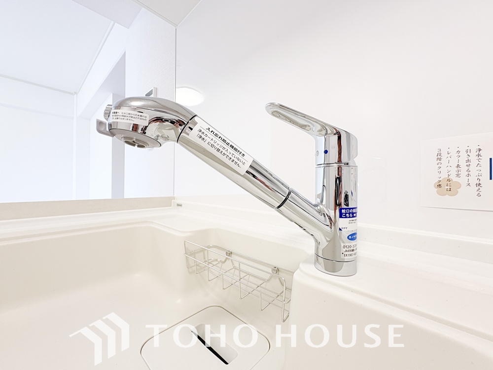 浄水器ボタンひとつで浄水と原水に切り替えられる浄水器一体型水洗を使用。