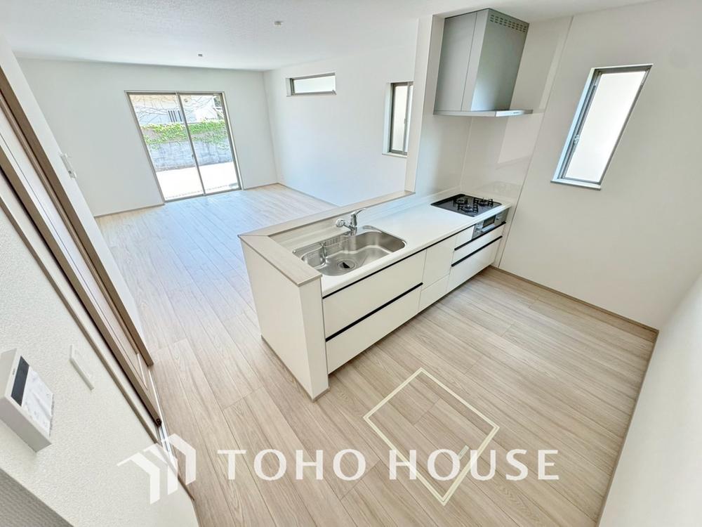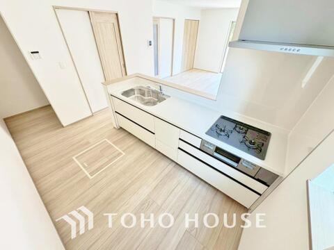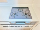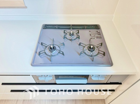見た目に美しくインテリア性にも優れお掃除も簡単。3口コンロで忙しくても同時に調理で便利ですね。