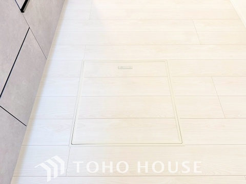 キッチン下部に設けた床下収納。缶詰のストックや非常食、梅酒や味噌などの保存食入れとして利用可です。