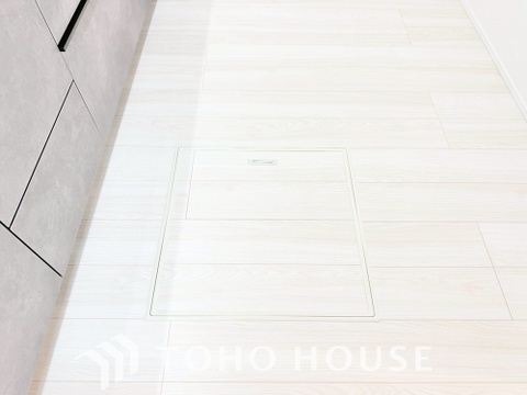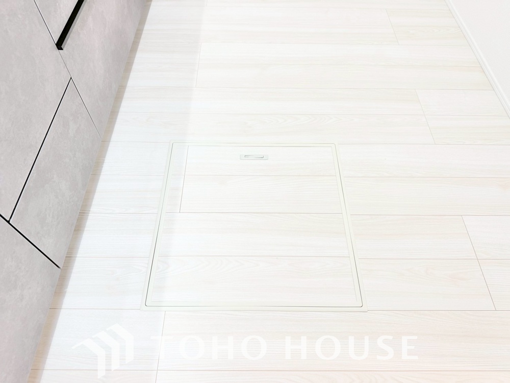 キッチン下部に設けた床下収納。缶詰のストックや非常食、梅酒や味噌などの保存食入れとして利用可です。