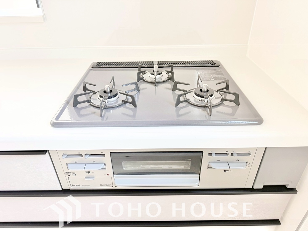 3口コンロは一度に複数のお料理を作ることができるメリットがあります。毎日のキッチンタイムを効率よく。