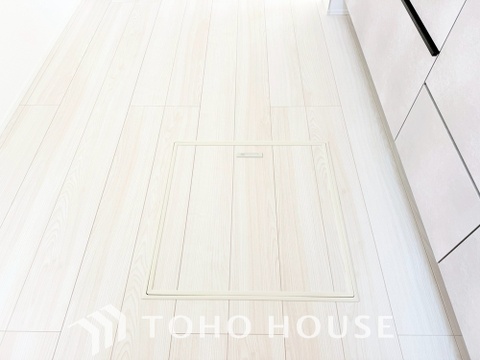 キッチン下部に設けた床下収納。缶詰のストックや非常食、梅酒や味噌などの保存食入れとして利用可です。