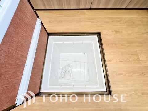 キッチン下部に設けた床下収納は、缶詰のストックや非常食、梅酒や味噌などの保存食入れとしての他、卓上プレートや季節家電などの物を仕舞うことが出来る便利な収納。