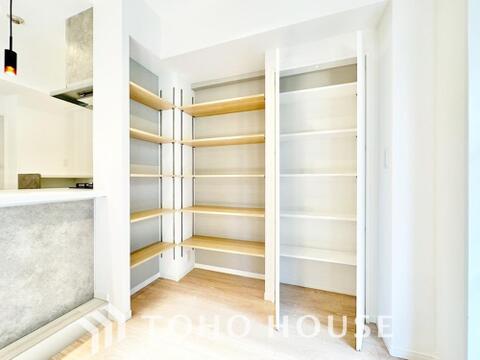 キッチン横にはパントリーを完備。ついつい買いすぎてしまった日用品や食料品のストックなどに。