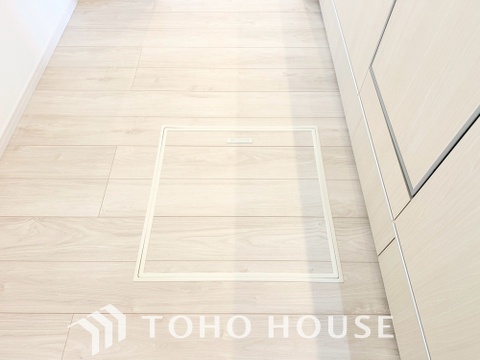 キッチン下部に設けた床下収納。缶詰のストックや非常食、梅酒や味噌などの保存食入れとして利用可です。