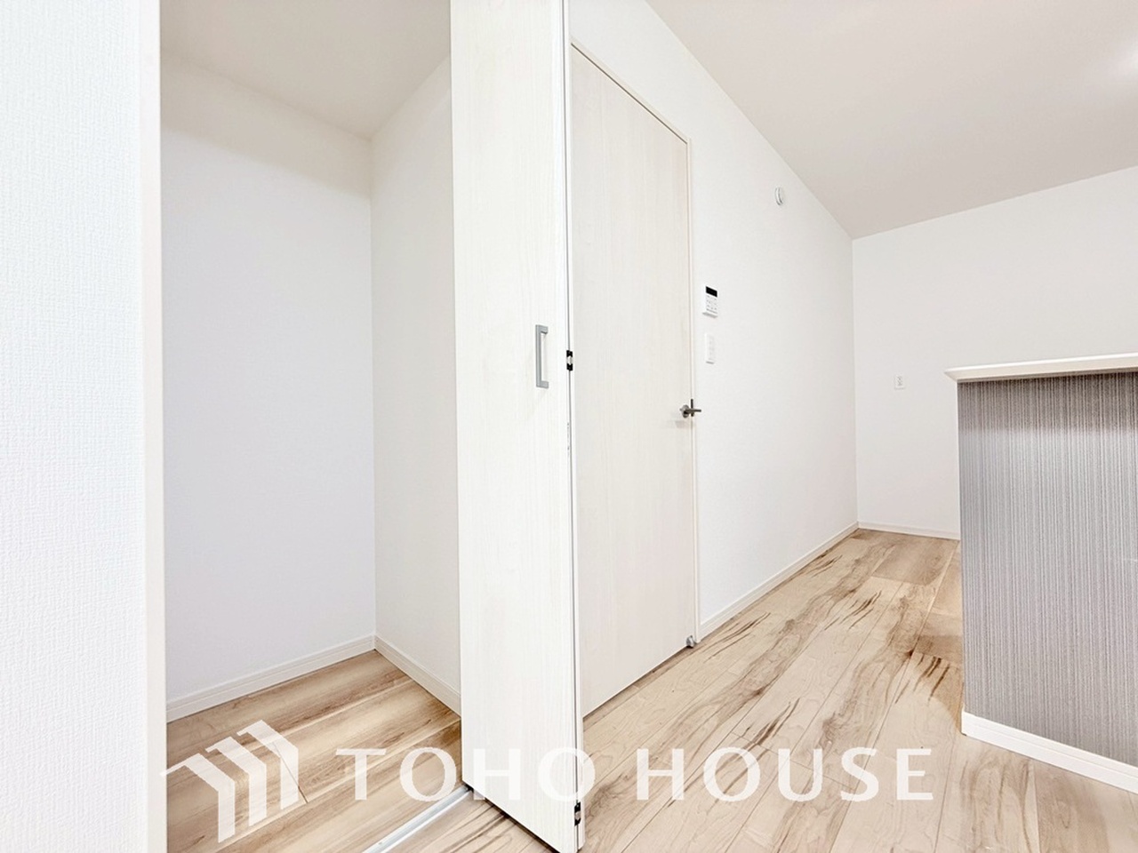 玄関そばの廊下収納。日用品のストックや防災グッズを置いたりと、何かと便利に使えます。