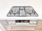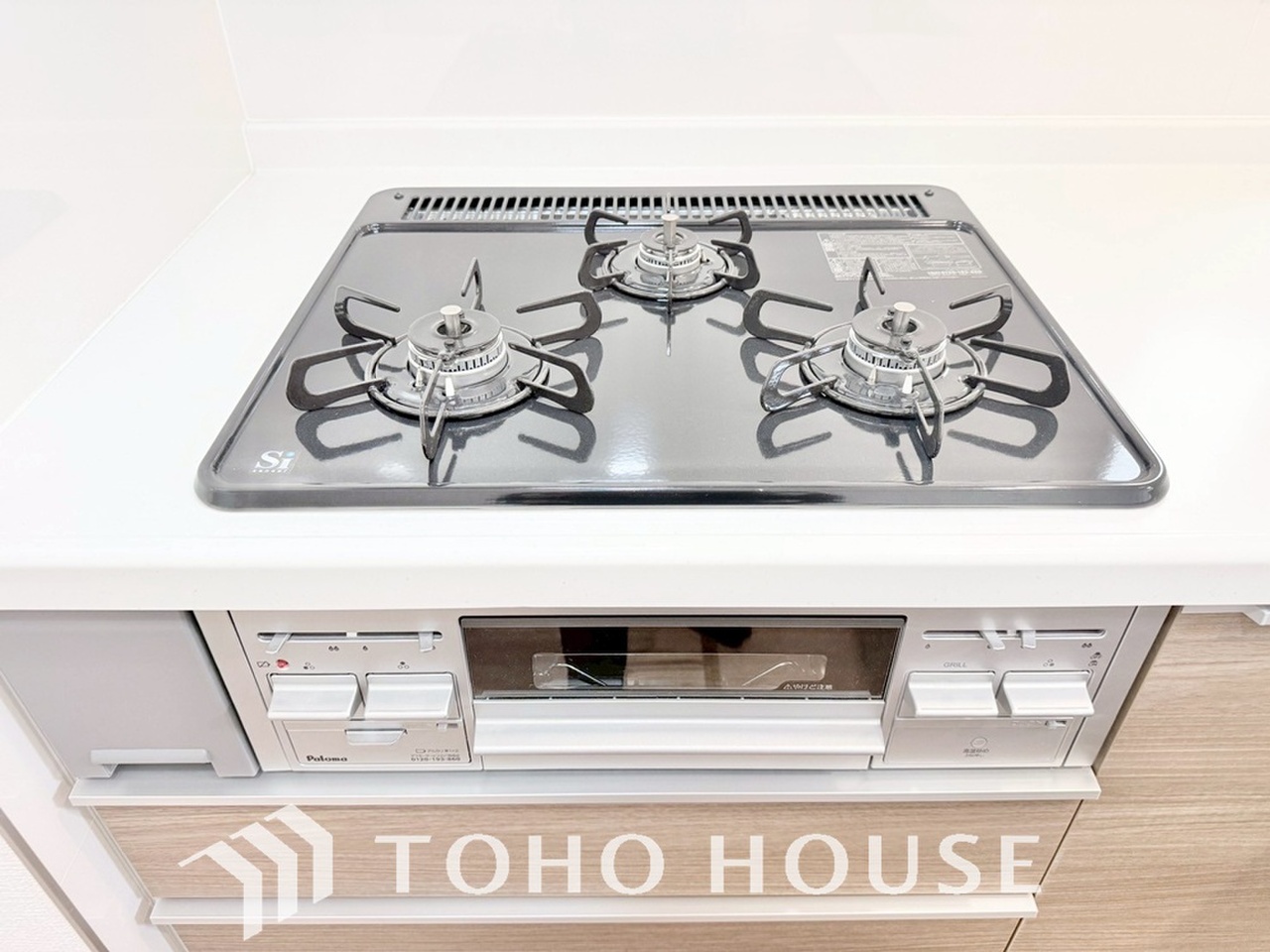 見た目に美しくインテリア性にも優れお掃除も簡単。3口コンロで忙しくても同時に調理で便利ですね。