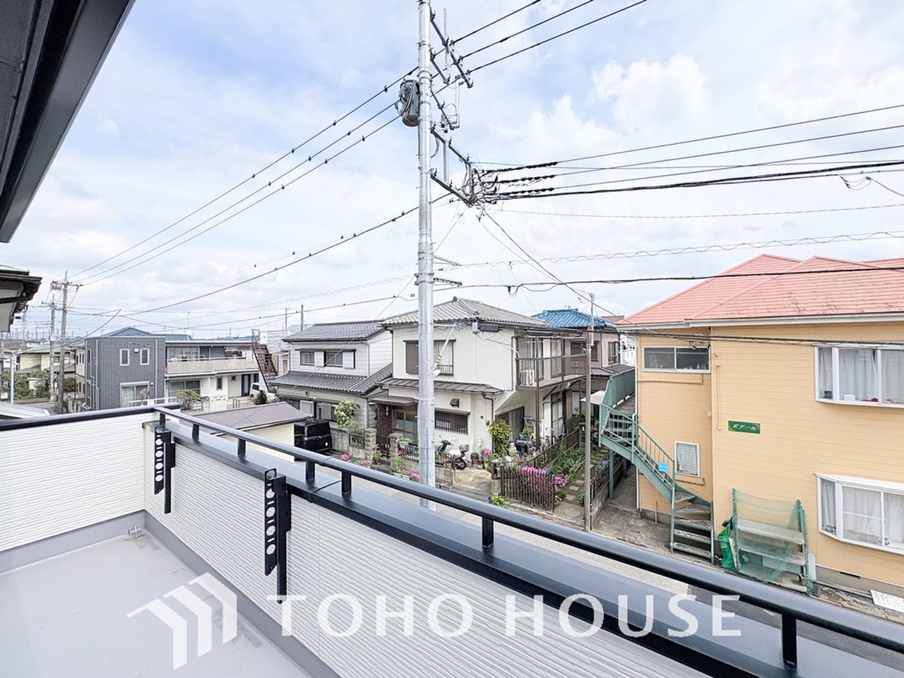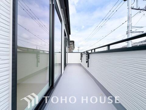 青空を感じられるバルコニーには爽やかな風が吹き抜け、周辺には戸建住宅街の景色が広がります。