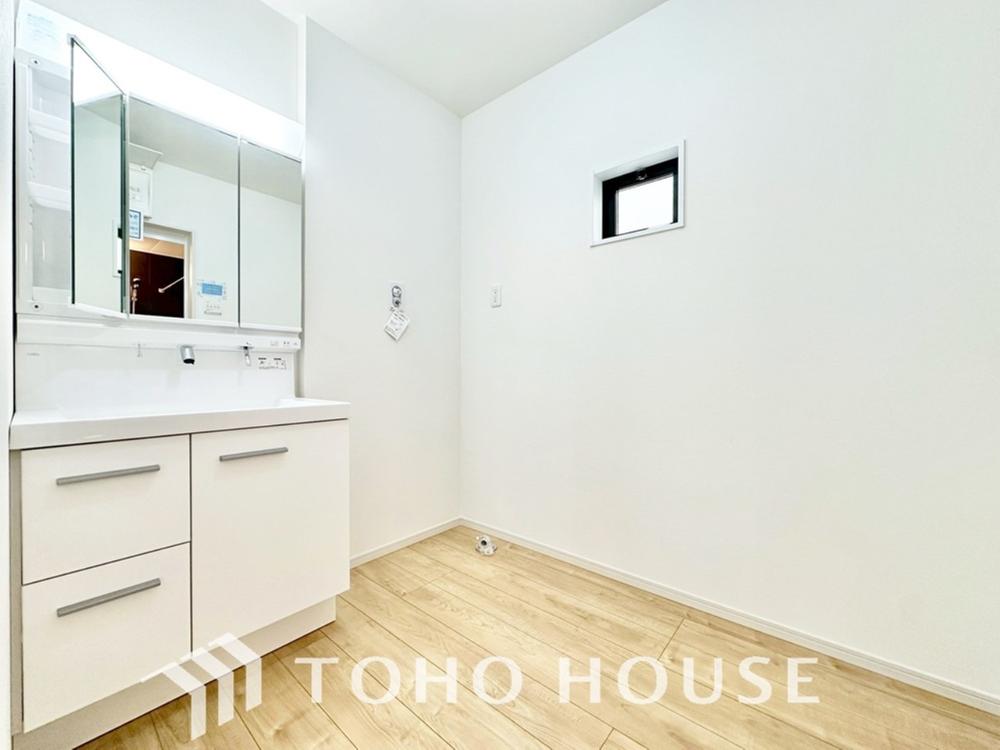 身だしなみのチェックがしやすい大きな鏡、下には収納がたっぷり。スッキリとした空間を演出いたします。