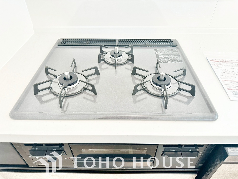 3口コンロは一度に複数のお料理を作ることができるメリットがあります。毎日のキッチンタイムを効率よく。
