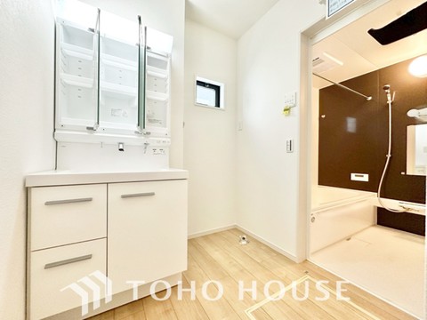 お家の中でも特にプライベートスペースとなる洗面所は、洗濯場所と浴室を同じ空間でまとめております。