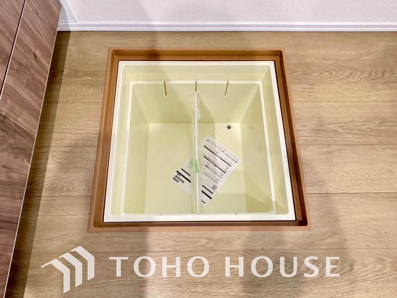 キッチン下部に設けた床下収納。缶詰のストックや非常食、梅酒や味噌などの保存食入れとして利用可です。
