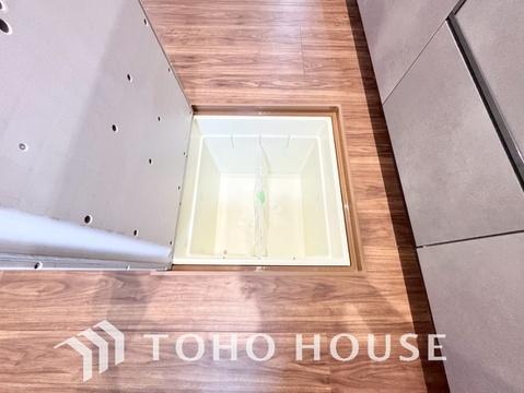 スペースを上手く活用した床下収納はあると何かと便利。食料のストック品はもちろん、掃除用具など。