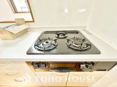 見た目に美しくインテリア性にも優れお掃除も簡単。3口コンロで忙しくても同時に調理で便利ですね。