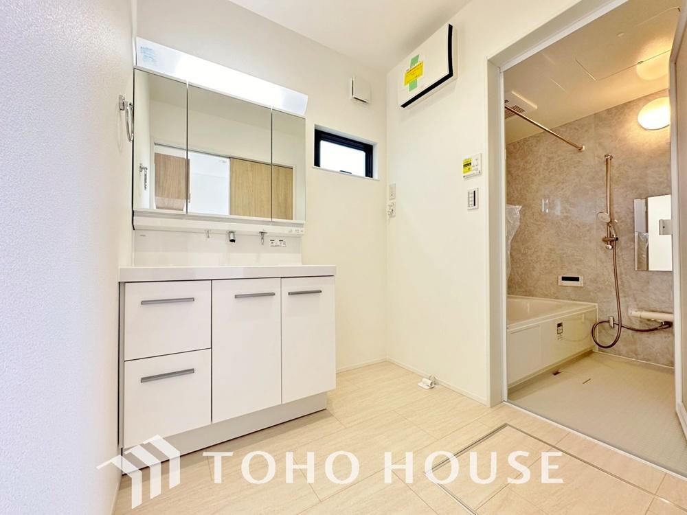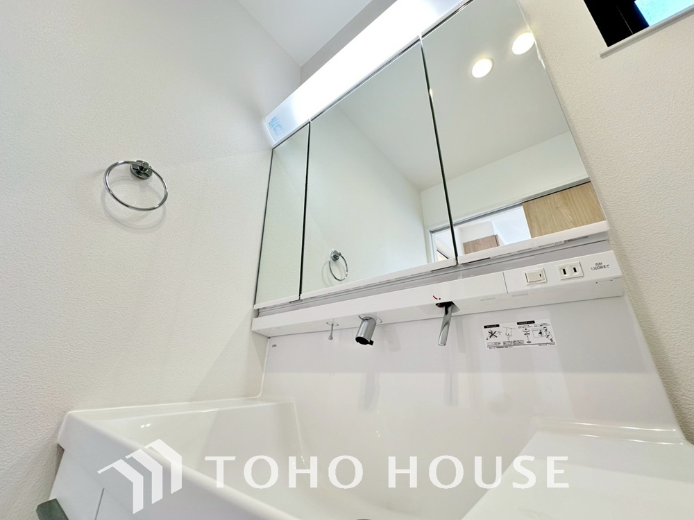 洗面台には三面鏡を採用。鏡の後ろに収納スペースを設ける事により洗面台周りもすっきりします。
