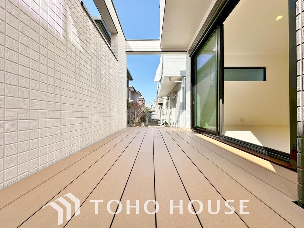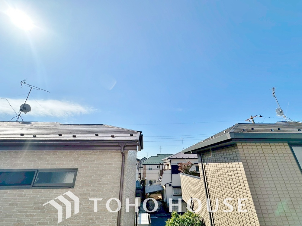 青空を感じられるバルコニーには爽やかな風が吹き抜け、周辺には戸建住宅街の景色が広がります。