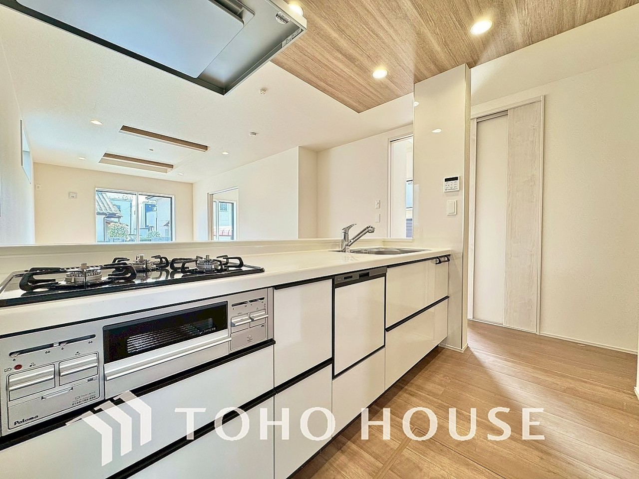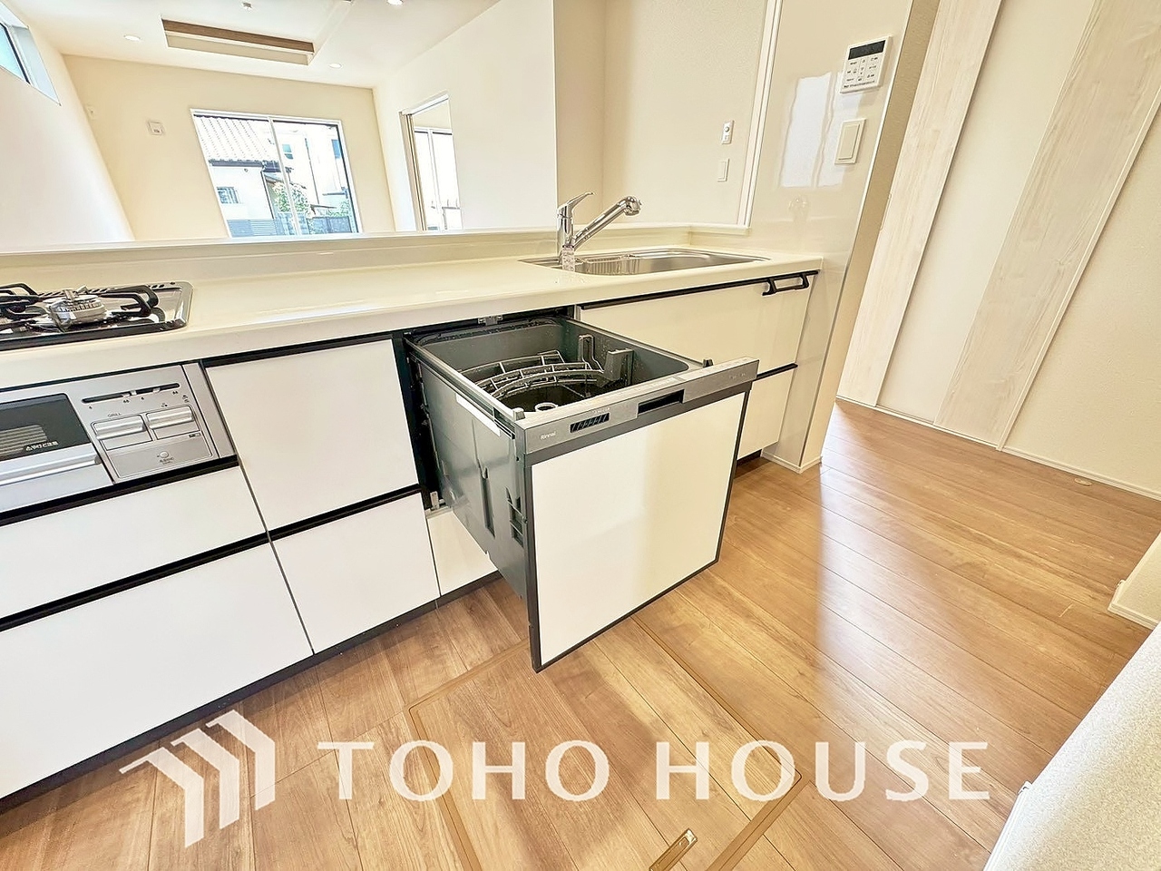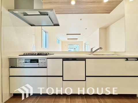 ビルトイン食器洗浄乾燥機付きのシステムキッチン。毎日の家事負担を軽減する嬉しい設備です。