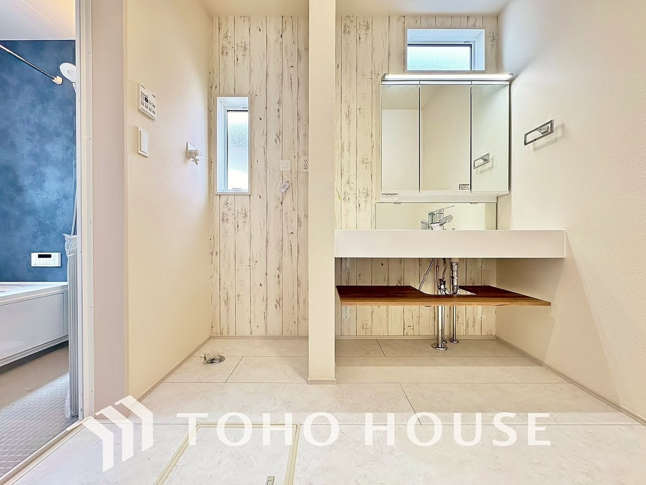お家の中でも特にプライベートスペースとなる洗面所は、洗濯場所と浴室を同じ空間でまとめております。