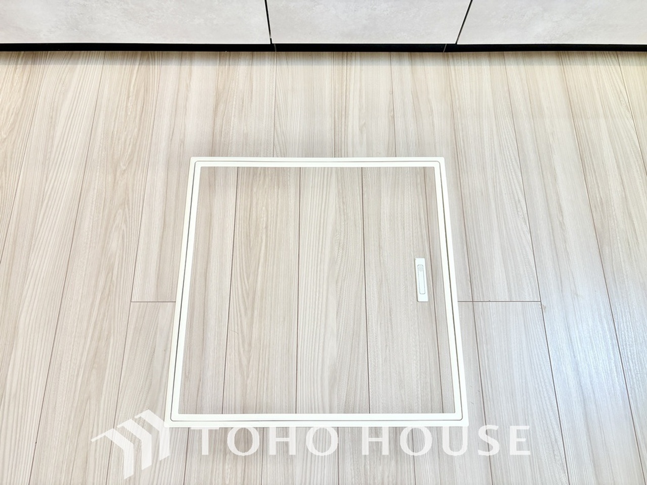スペースを上手く活用した床下収納はあると何かと便利。食料のストック品はもちろん、掃除用具など。