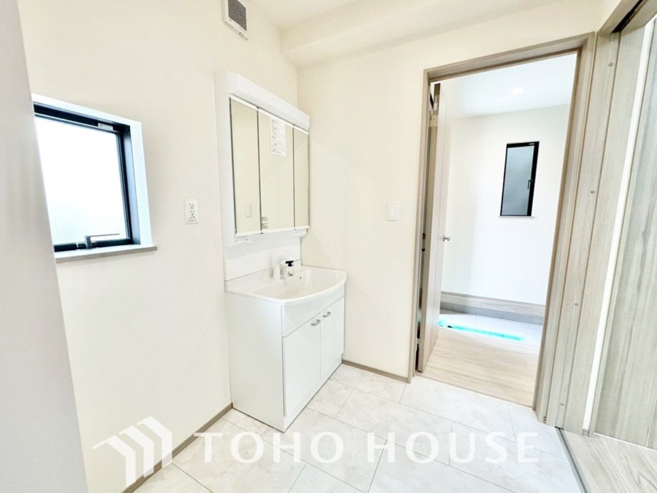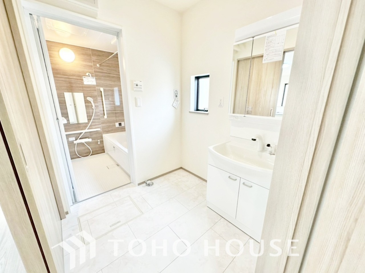 お家の中でも特にプライベートスペースとなる洗面所は、洗濯場所と浴室を同じ空間でまとめております。