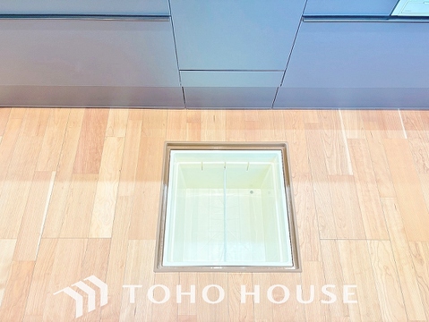 スペースを上手く活用した床下収納はあると何かと便利。食料のストック品はもちろん、掃除用具など。