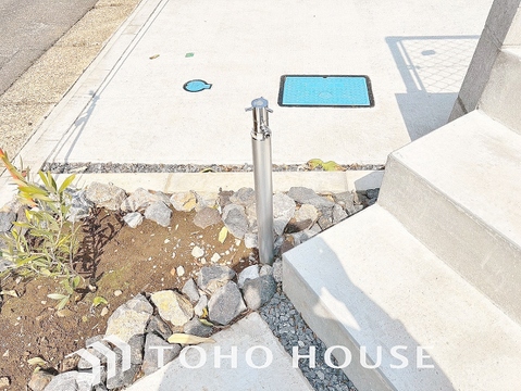 お庭には立水栓がございます。お車やお庭の手入れや、外回りのお掃除の際にあると、便利です。