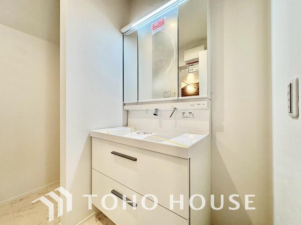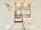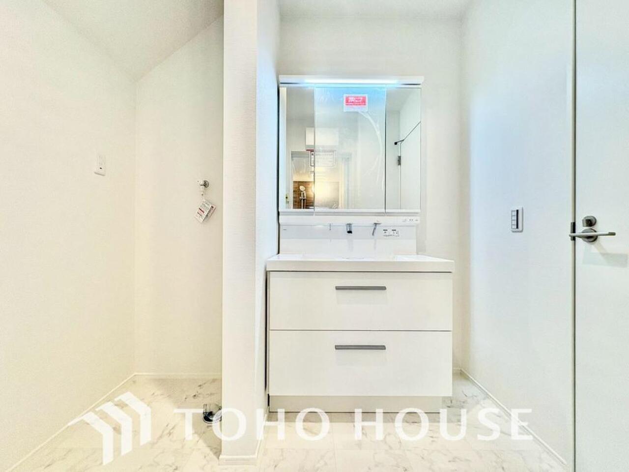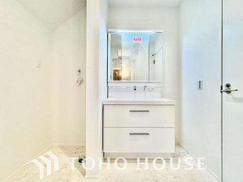 シャワー機能付きの洗面台には使いやすい横長ボウル、スマートに収まる収納と充実しています。