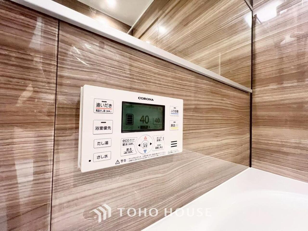 お風呂場と台所に操作リモコンがあり、キッチン近くにある給湯リモコンは、お料理の最中でもリビングで寛いでいるなかでもボタン一つで簡単に沸かせて便利ですね。
