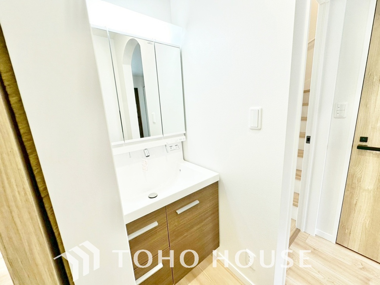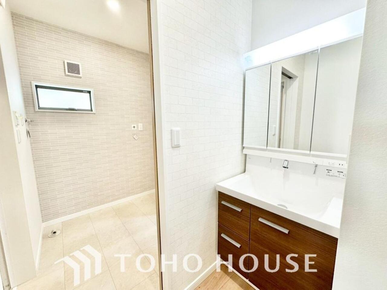 洗面台には三面鏡を採用。鏡の後ろに収納スペースを設ける事により洗面台周りもすっきりします。