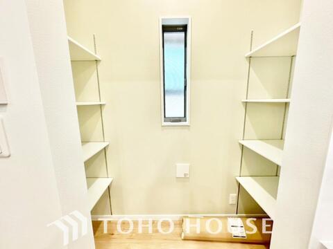 キッチン横にはパントリーを完備。ついつい買いすぎてしまった日用品や食料品のストックなどに。