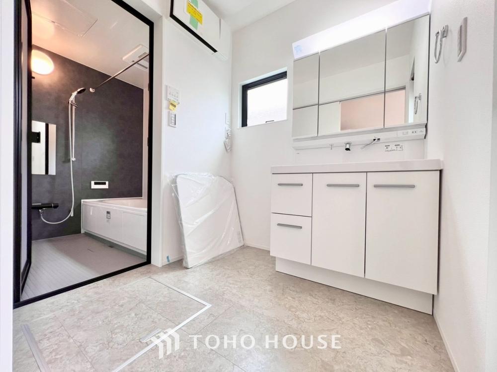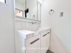 身だしなみのチェックがしやすい大きな鏡、下には収納がたっぷり。スッキリとした空間を演出いたします。